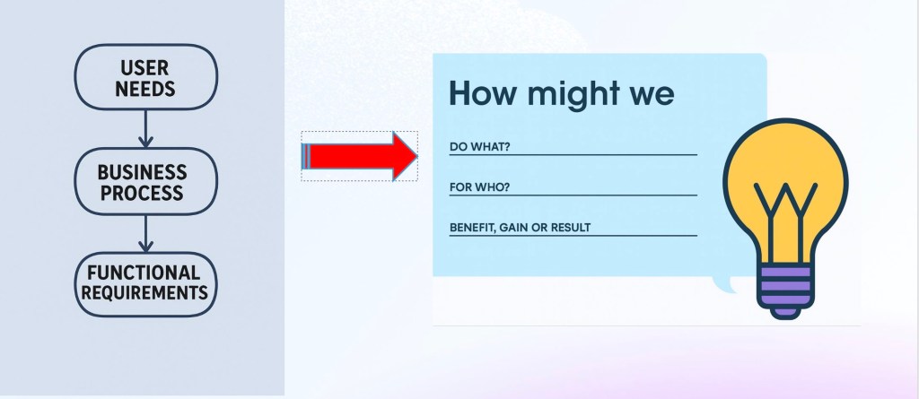 Stop thinking in functional requirements and start to think how might we do what, for who and what are the benefits, gains or results.