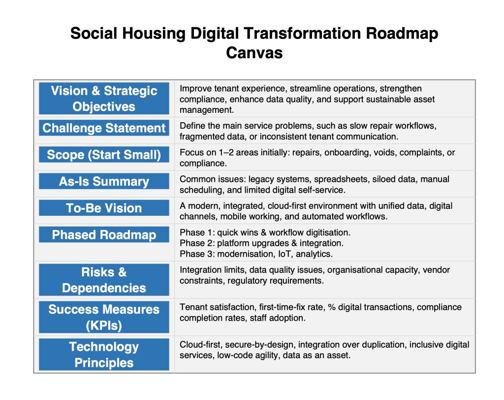 Social housing providers operate in an environment of rising tenant expectations, ageing housing stock, regulatory pressures, and funding constraints. Digital transformation offers significant opportunities to improve tenant experience, streamline processes, reduce costs, and enhance service resilience, but success requires a structured, incremental approach grounded in organisational realities.
